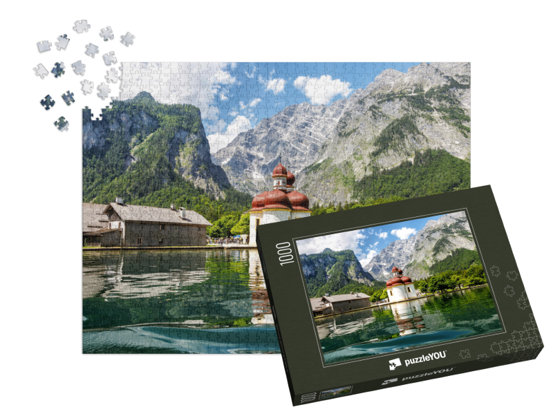 Alpenidylle zum Puzzeln: Der klare Königssee spiegelt die berühmte Wallfahrtskirche St. Bartholomäus vor einer faszinierenden Gebirgskulisse – Dieses Motiv lädt definitiv zum träumen ein.