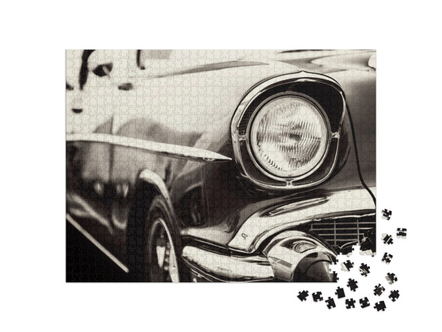 Puzzle „Ein roter Oldtimer mit Nahaufnahme der Scheinwerfer“