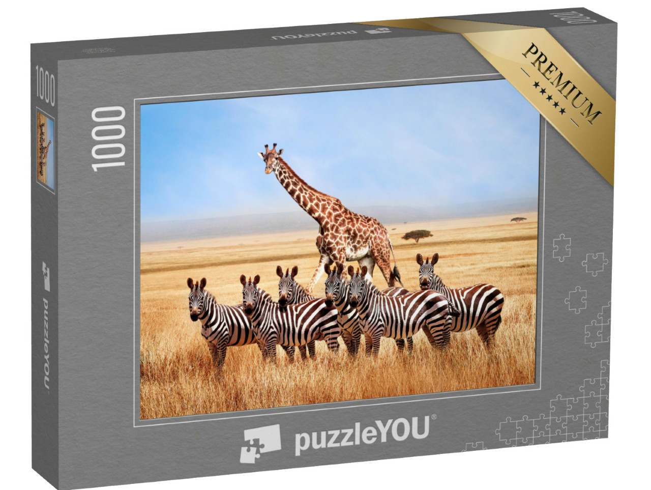 Puzzle „Gruppe von Zebras und Giraffe in der afrikanischen Savanne, Tansania“