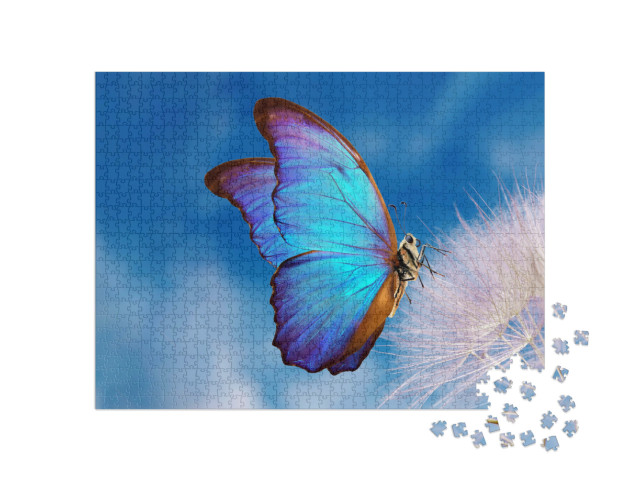 Puzzle „Der blaue Morpho Schmetterling auf einer Pusteblume“