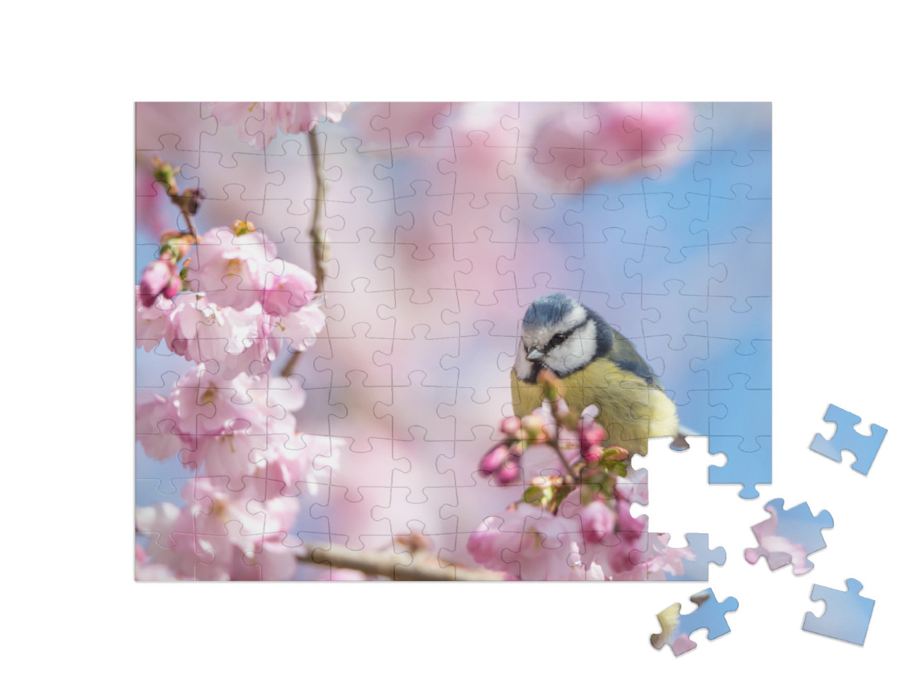 Puzzle „Eine Blaumeise sitzt auf einem schönen Zweig mit Kirschblüten“