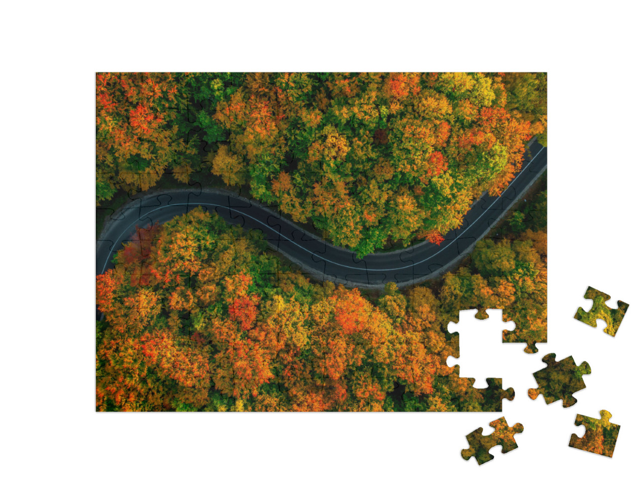 Puzzle „Vogelperspektive: Gewundene Straße im dichten Herbstwald“