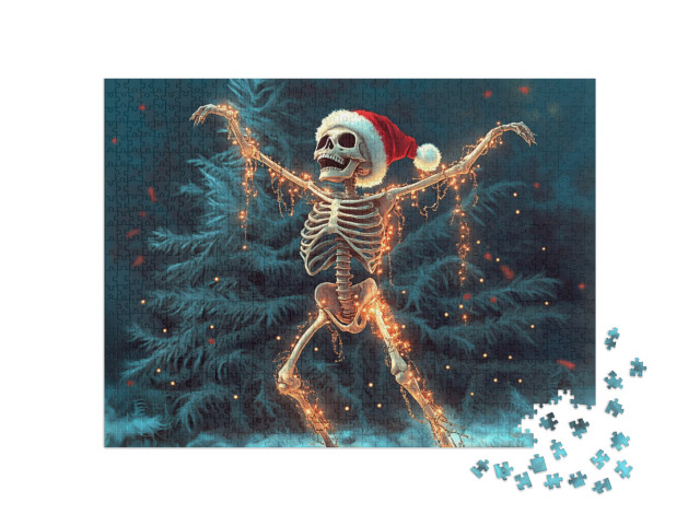 Puzzle „Tanzendes Weihnachtsmann-Skelett mit Santa Mütze im winterlichen Wald“